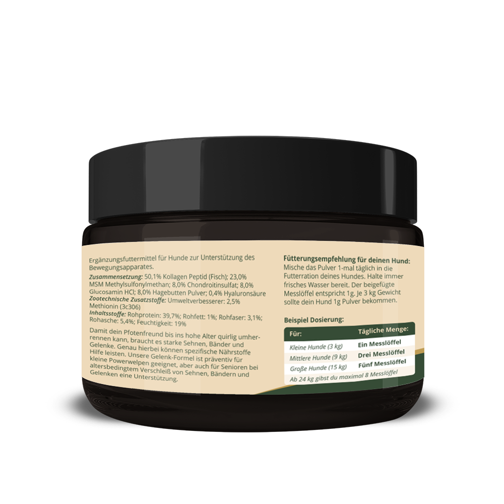 Die Gelenk-Formel wurde speziell entwickelt, um die Gesundheit der Gelenke und des Bewegungsapparates deines Hundes zu fördern. Mit einer natürlichen Kombination aus Glucosamin, MSM, Chondroitinsulfat, Hyaluron, Kollagen und Hagebuttenpulver bietet dieses Ergänzungsfuttermittel eine ganzheitliche Unterstützung für Knochen, Gelenke und Sehnen.